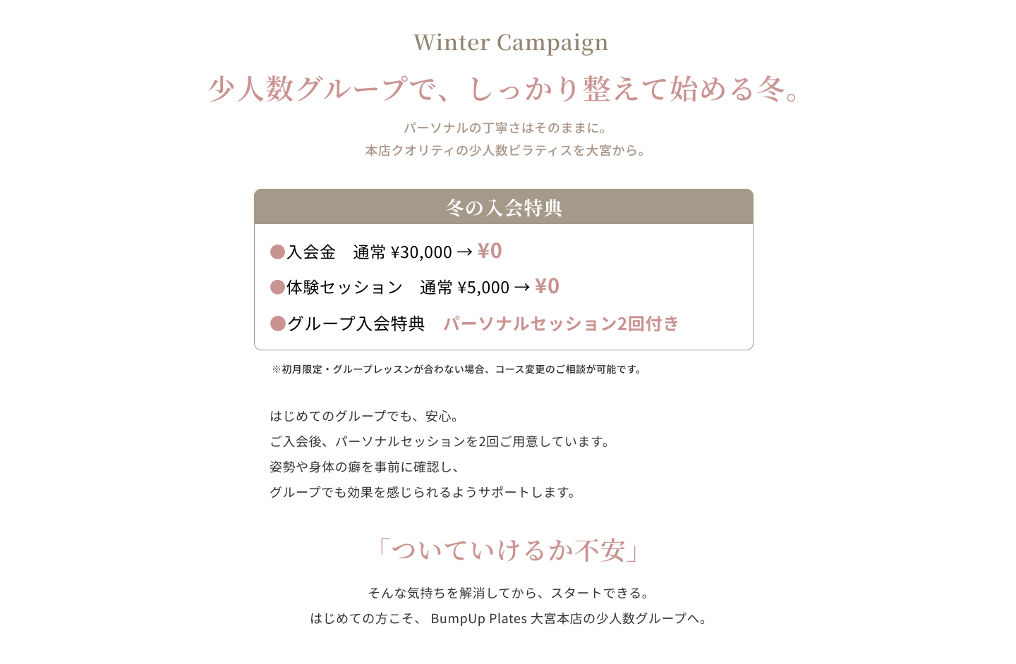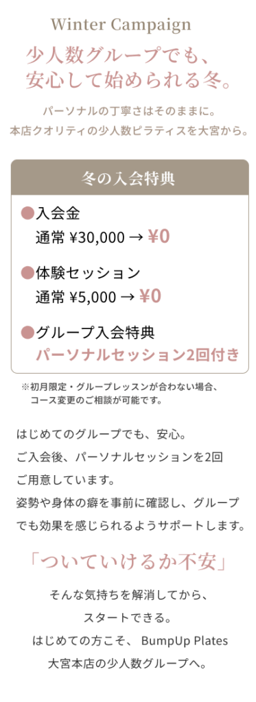 BumpUp大宮店では、最大4名までの少人数制グループレッスンを導入しています。一般的な大人数グループとは異なり、一人ひとりの動き・姿勢・クセをしっかり確認しながら進めるため、パーソナルに近いサポート品質を保ったまま受講いただけます。レッスン内容はピラティスを軸に、自重・ダンベルを用いた筋力トレーニングを組み合わせた構成。体幹の安定・姿勢改善・運動不足解消を目的とした方に特におすすめです。また、●運動初心者の方●グループレッスンが初めての方●年齢や運動経験に不安のある方も安心してご参加いただけるよう、難易度や負荷は参加者に合わせて調整しています。さらに、K-ピラティス(リボーンメソッド)をベースにしたクラスも実施しており、韓国式ピラティスならではの「コントロール」「安定性」「正確な動き」をグループでも丁寧に体感していただけます。「パーソナルは少しハードルが高い」「でも、しっかり見てもらいたい」そんな方にこそ、BumpUpの少人数グループレッスンは最適な選択です。