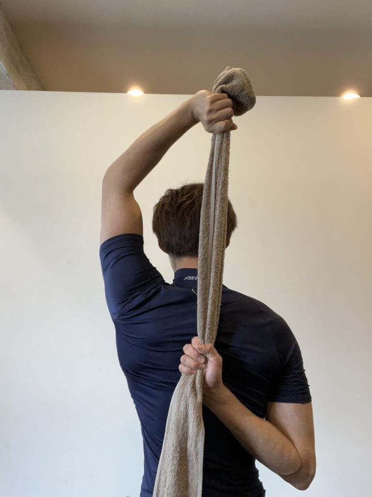 3.これを20〜30秒程度行い、慣れてきたら徐々にタオルを持つ位置を短くしていきます!