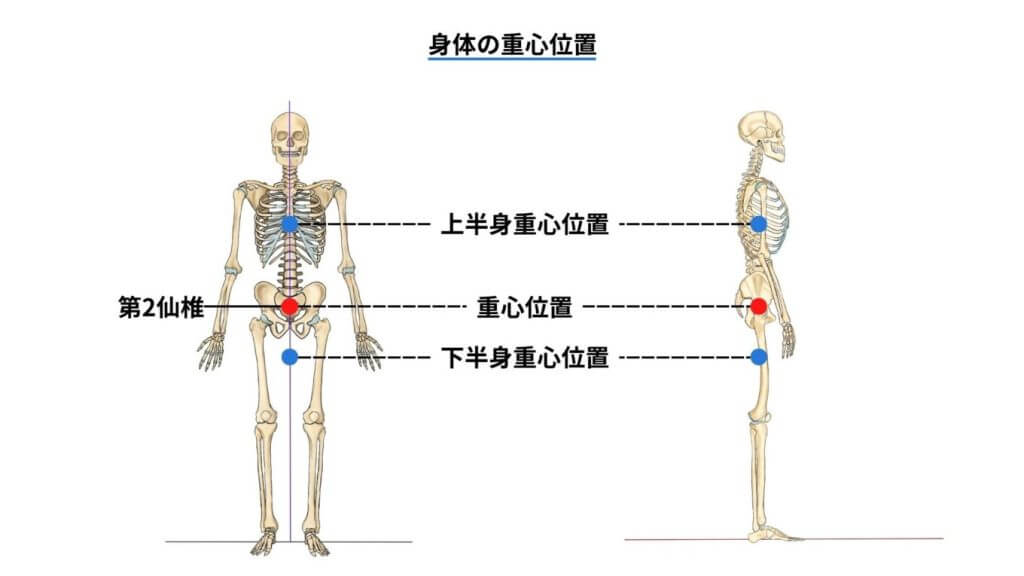 なお、上半身の重心位置は第7~9胸椎の辺り、下半身の重心位置は大腿部中央より少し上にあります。
