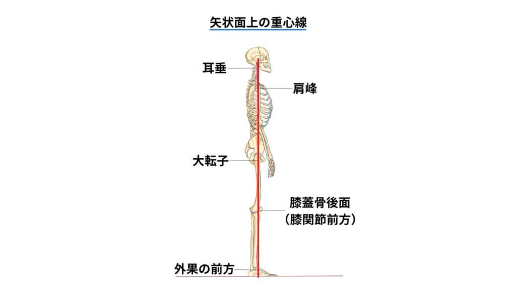 重心線をイメージしやすいようにした姿勢の評価方法が、「耳垂・肩峰・大転子・膝蓋骨の後面・外果のやや前方」をランドマークとしたものです。