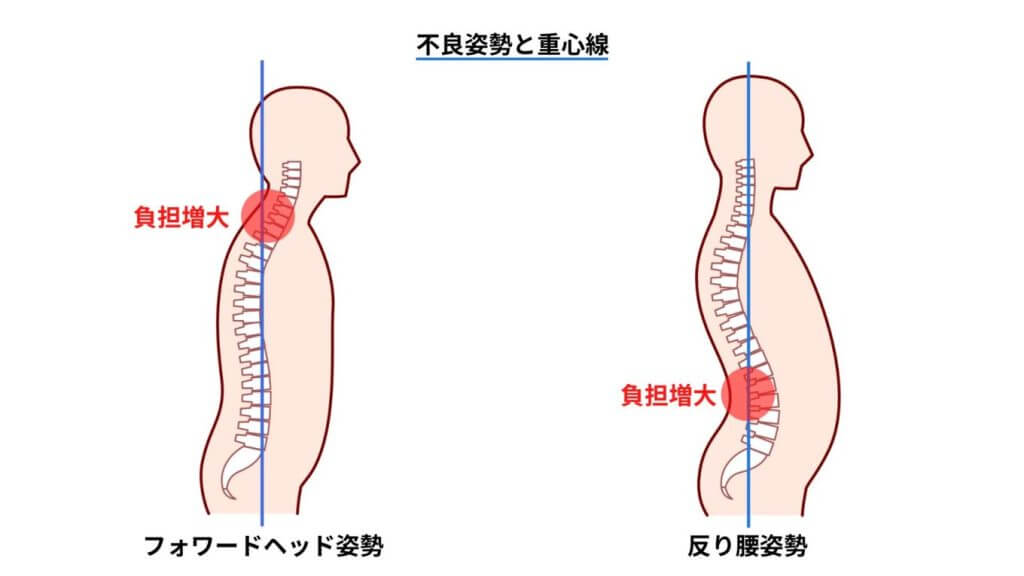 反り腰姿勢で腰椎が重心線よりも前に出ていれば、腰背部の筋への負荷が増大し、腰痛につながるかもしれません。